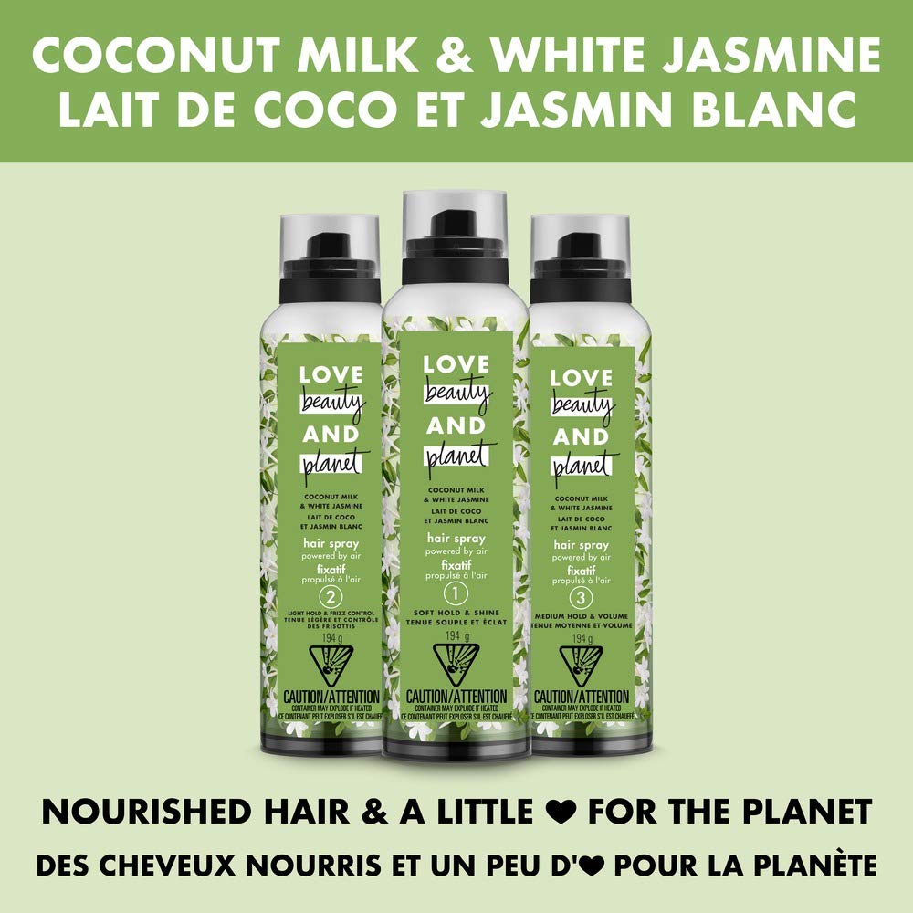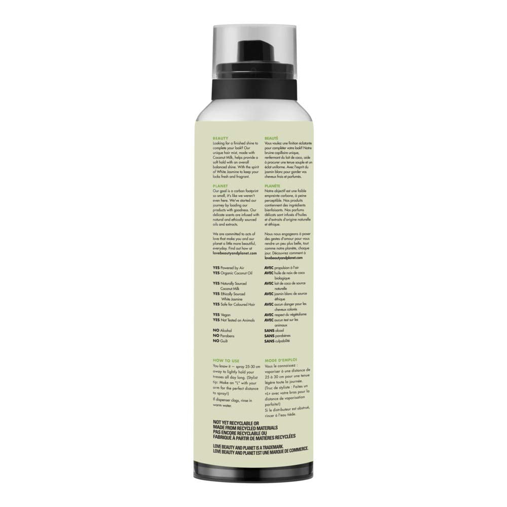 Hair spray powered by air and not greenhouse gases. Looking for a finished shine to complete your look? Our unique hair spray, infused with Coconut Milk, helps provide a soft hold with glimmering, all over shine. Blended with the spirit of White Jasmine to keep hair fresh and fragrant. This hair spray is also 95% Naturally Derived and cruelty-free, paraben-free, & alcohol-free